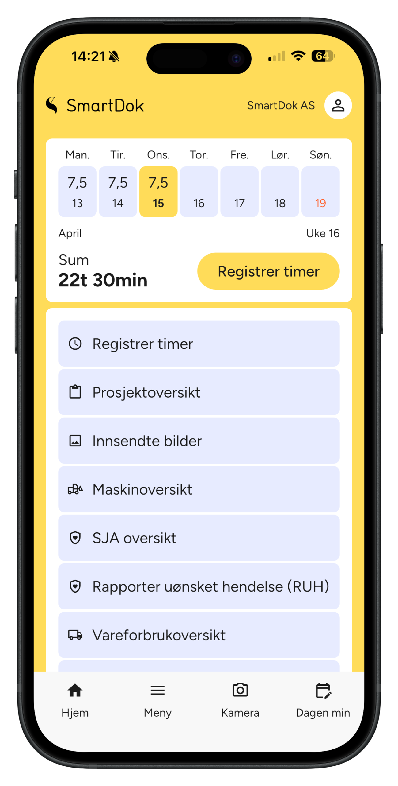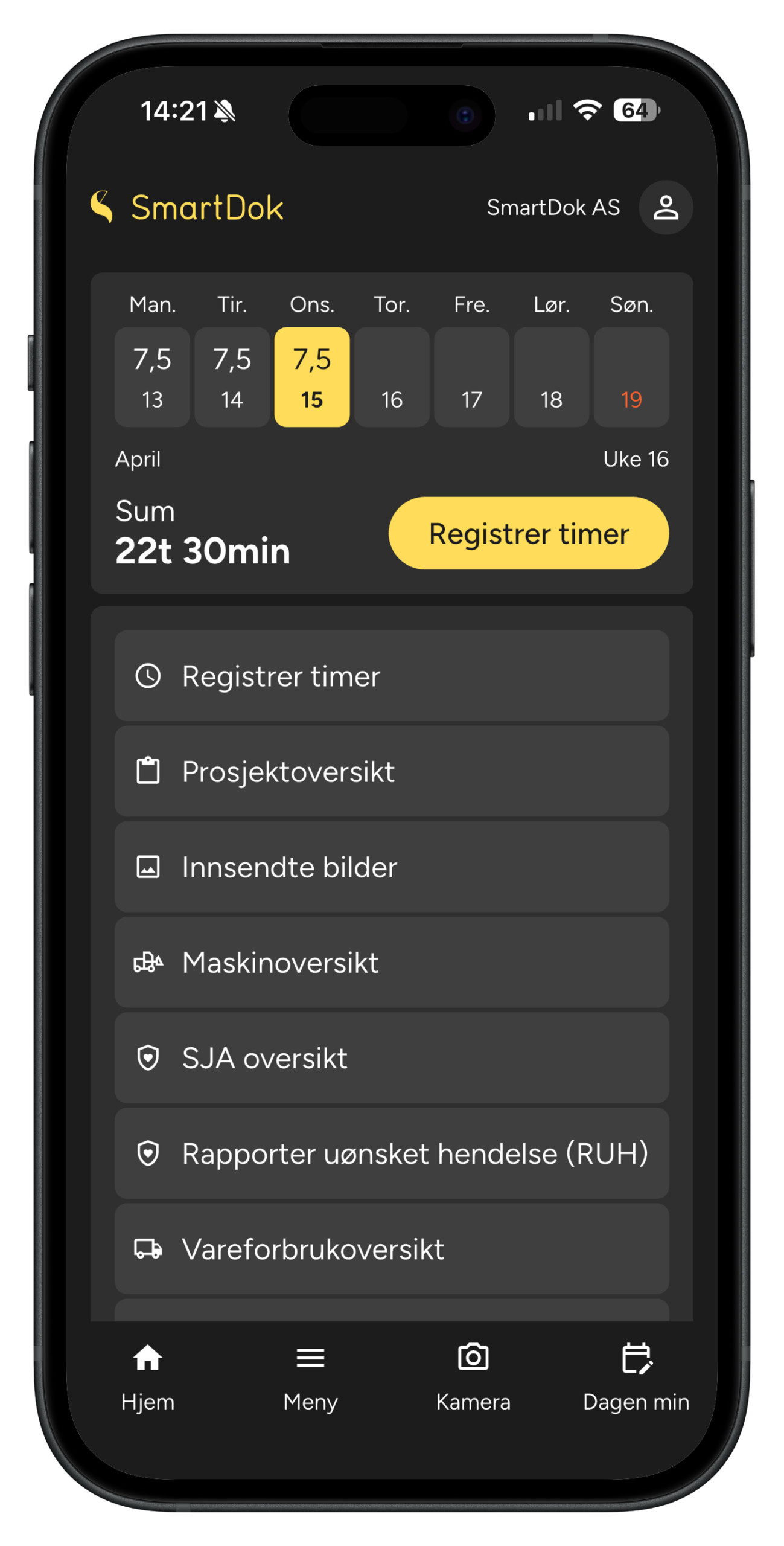 Jobber du etter at sola har gått ned? Aktiver mørk modus i appens innstillinger, så slipper du den blendende hvite skjermen. En liten ting som utgjør en stor forskjell når du må registrere timer i mørket.